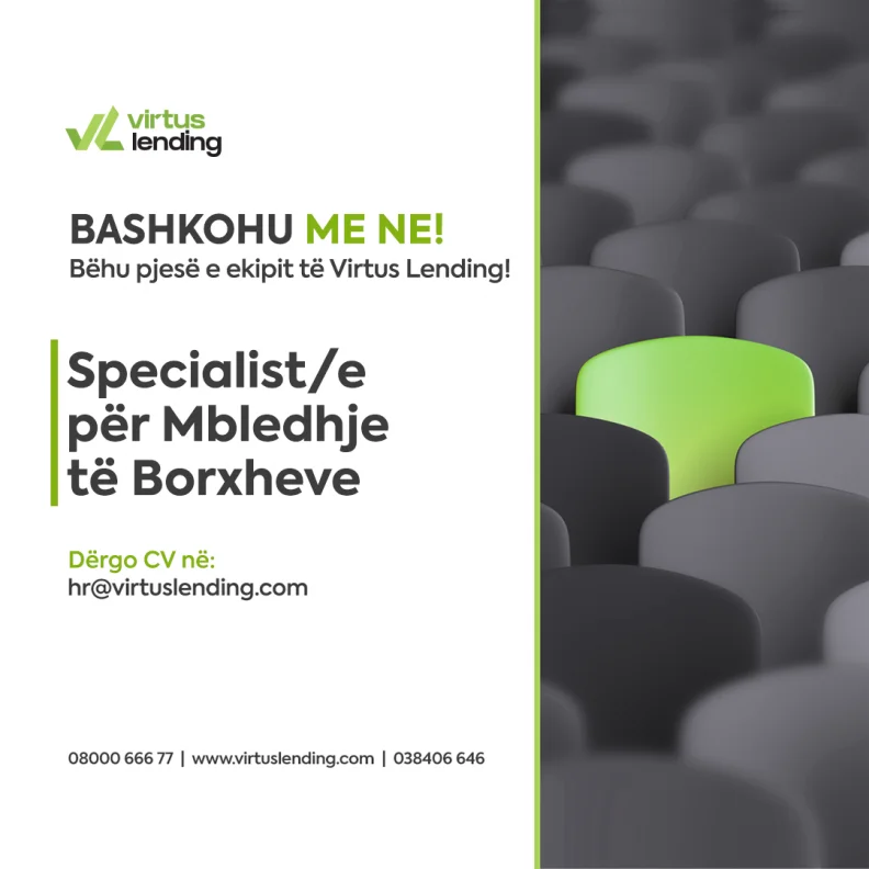 Virtus Lending LLC është Institucion Financiar Jo-bankar (IFJB) i licensuar nga Banka Qendrore e Republikës së Kosovës. Ne ofrojmë financim për blerjen e automjeteve përmes lizingut financiar për të gjitha markat dhe modelet pa ndonjë kufizim të vitit të prodhimit. Operacionet aktuale përfshijnë Kosovën, me synim zgjerimi në Shqipëri dhe Maqedoninë e Veriut. Me qëllim të zgjerimit të aktivitetit në tregun financiar, Virtus Lending LLC po kërkon kandidatë të kualifikuar për pozitën e “Specialist/e për Mbledhje të Borxheve”.